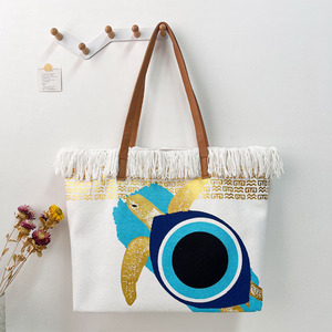 Groothandel Op Maat Print Patroon Logo Reizen Souvenir Strandtassen Canvas Blauw Boze Oog Duivel Grote Draagtas Strandtas